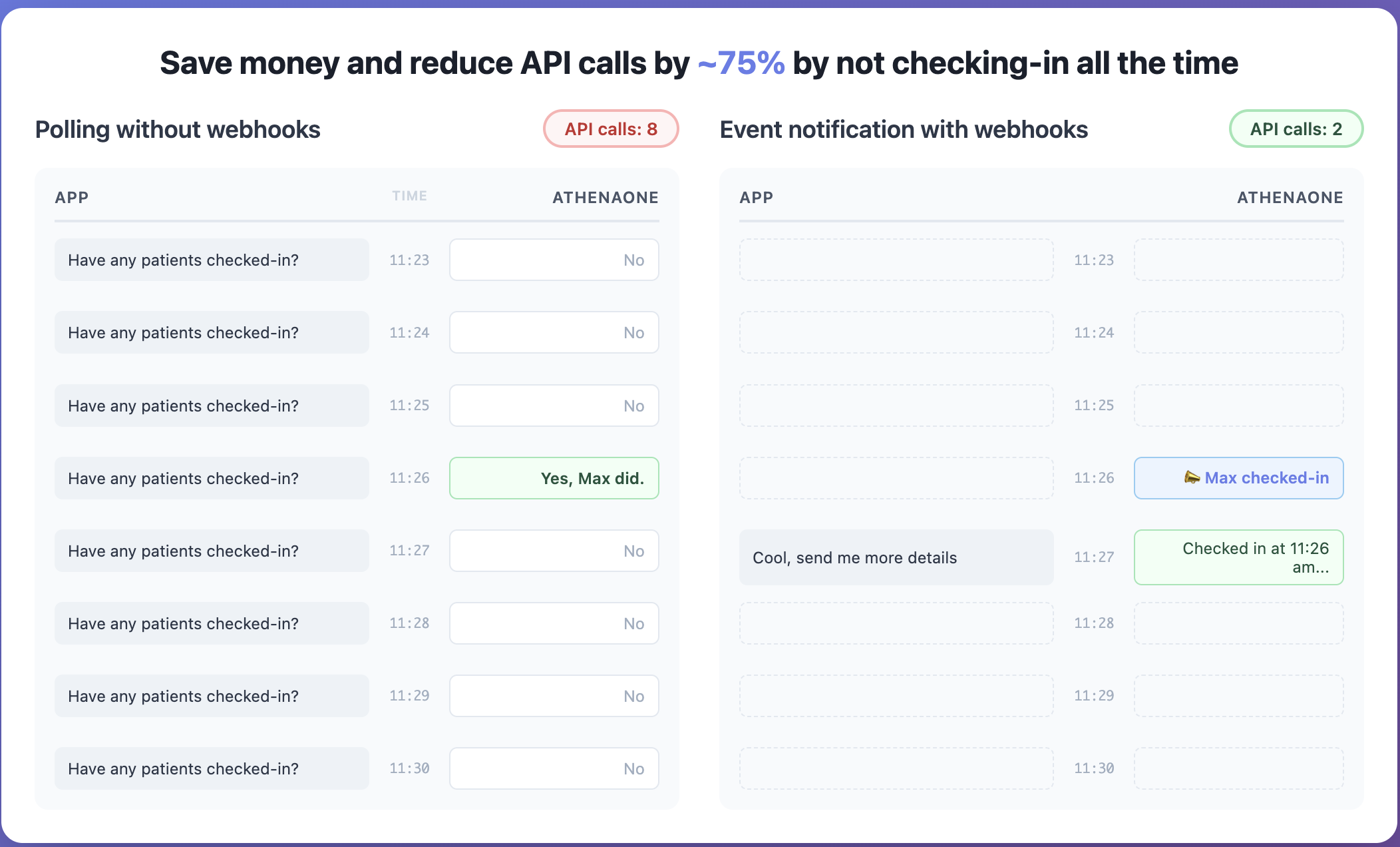 A typical health tech company polling a practice for patient check-ins makes ~23,000 API calls per month just to catch maybe 2,800 actual events. Scale that to 10 practices and you're at 230,000 polling calls for 28,000 events monthly. With webhooks? You get 28,000 notifications, and even if you retrieve data for every single one, that's 56,000 total API calls, a 75% reduction. For many marketplace vendors that will be thousands of dollars saved monthly that goes straight to your bottom line.